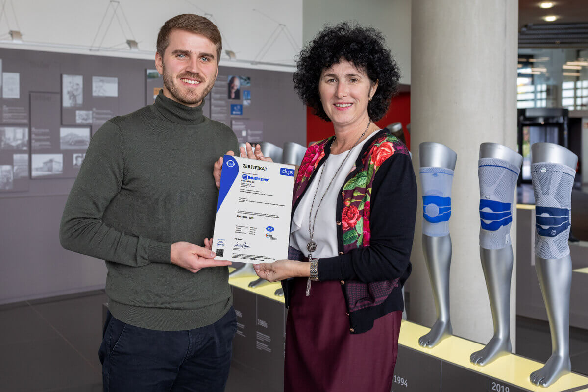 Katharina Dietrich, Vorständin Technik, und Umweltmanager Justus Tilly freuen sich über das frisch eingetroffene ISO-Zertifikat, denn damit ist es amtlich: Bauerfeind hat erfolgreich das weltweit anerkannte Umweltmanagementsystem ISO 14001 am Standort Zeulenroda eingeführt. Die internationale Norm legt Anforderungen fest, mit denen ein Unternehmen seine Umweltleistung verbessern und Umweltziele erreichen kann. In drei mehrtägigen Audits im Juni und November 2022 sowie im Januar 2023 wurden verschiedenste umweltrelevante Prozesse geprüft. Als Ergebnis steht der durch externe Auditoren bestätigte Nachweis: Bauerfeind hat ein Managementsystem aufgebaut, das die kontinuierliche Verbesserung der ökologischen Nachhaltigkeit gewährleistet.