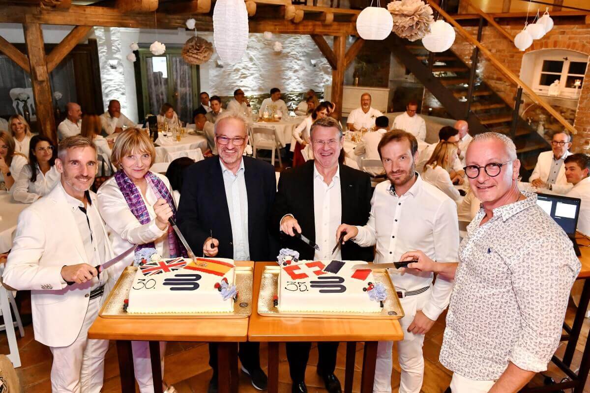 Four cakes were presented at the annual meeting of the subsidiaries in late September in Zeulenroda. And this is why: four subsidiaries celebrated anniversaries this year. In addition to subsidiaries in Spain and Great Britain that have existed for 30 years each, the French and Swiss subsidiaries can look back on 35 successful years of business. After being congratulated and thanked by the Executive Board, everyone received a piece of delicious birthday cake. Enjoying cutting the cake (from left to right): Miguel Diez (Managing Director Bauerfeind Ibérica), Elizabeth Crane (Managing Director Bauerfeind UK), Rainer Berthan (Chief Executive Officer Bauerfeind AG), Philippe Chenaie (Managing Director Bauerfeind France), Nils Oppermann (Head of International Sales Bauerfeind AG), and Marc Déverin (Managing Director Bauerfeind Switzerland).